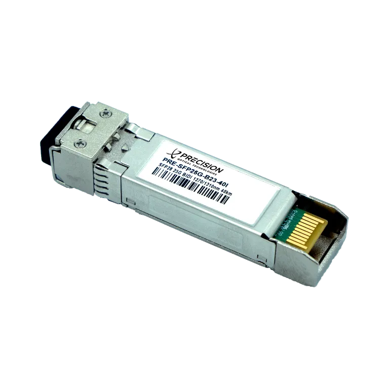 Der optische Transceiver SFP25G-B23(32)-40(I) unterstützt 25G Ethernet über Singlemode-Glasfaser mit einer Reichweite von bis zu 40 Kilometer unter Verwendung der BIDI-Technologie mit Wellenlängen von 1270/1330 nm.