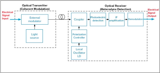 Coherent Optical Communication uses coherent modulation at the transmitting end of a fiber optic link and additional coherent technology at the receiving end for detection.  In this technique, both the amplitude and phase of the light waves are modulated to represent digital data, enabling high-speed and long-distance transmission of information.  On the receiving end, sophisticated signal processing techniques are used to detect and decode the transmitted signals accurately, even in the presence of noise and distortion.   Maintaining a phase reference between the transmitted and received signals enables more precise detection and extraction of information.  Coherent communication allows for higher data rates at longer transmission distances and increased spectral efficiency compared to other optical communication methods such as NRZ (non-return-to-zero) or PAM-4 (Pulse Amplitude Modulation – 4 levels).